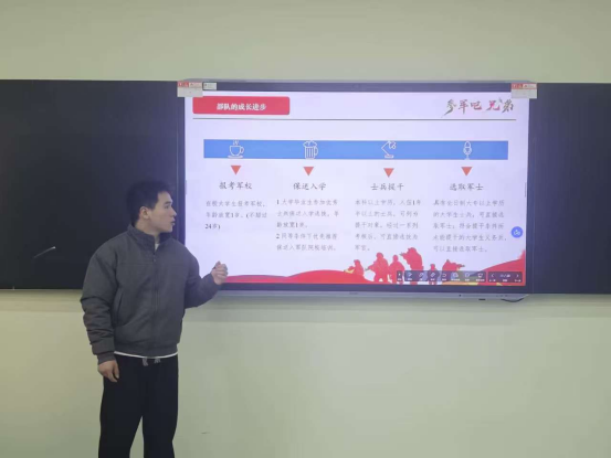 宣讲会上,王翔宇结合自身军旅生涯的宝贵经历,深刻阐释了参军入伍对个人成长成才、助力国防建设的重要意义。他聚焦应征入伍的年龄限制、身体条件、学历门槛等核心要求展开详细讲解,同时对报名流程、体检政审标准、入伍后的优抚优待政策以及退役复学的相关优惠举措进行了全面细致的解读。王翔宇分享了自己参军时的真切感悟与赤诚初心,以亲身经历激励在场同学积极响应国家号召,投身绿色军营,在强军征程中实现青春价值。